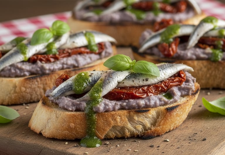 Bruschetta di pane cotto a legna con crema di melanzane, acciughe del Cantabrico, pomodori secchi e salsa al basilico