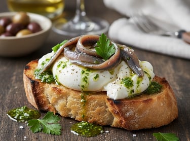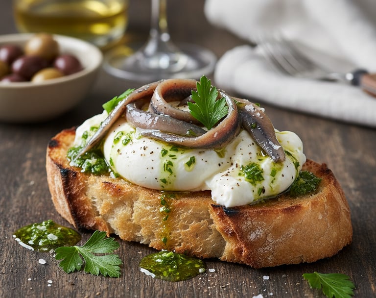 Bruschetta di pane con burrata alici del cantabrico e salsa al prezzemolo