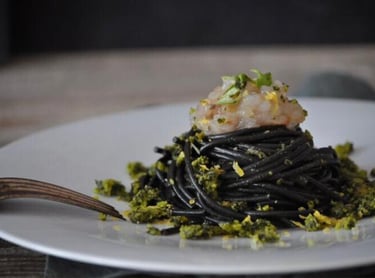 Spaghetti di Gragnano al nero di seppia tartare di gamberi, bottarga di tonno e zeste di limone