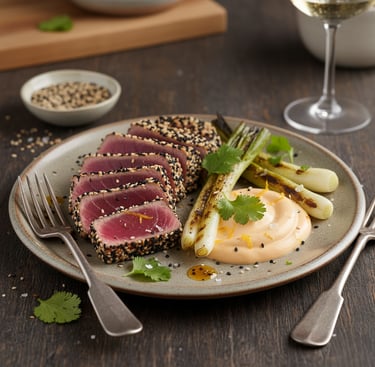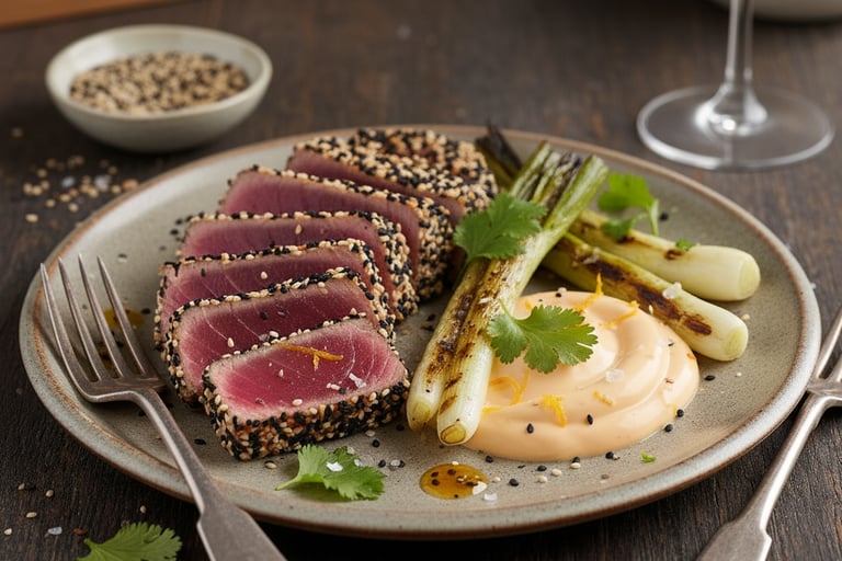Tagliata di Tonno ai 2 sesami con maionese all’arancia e cipollotto grigliato